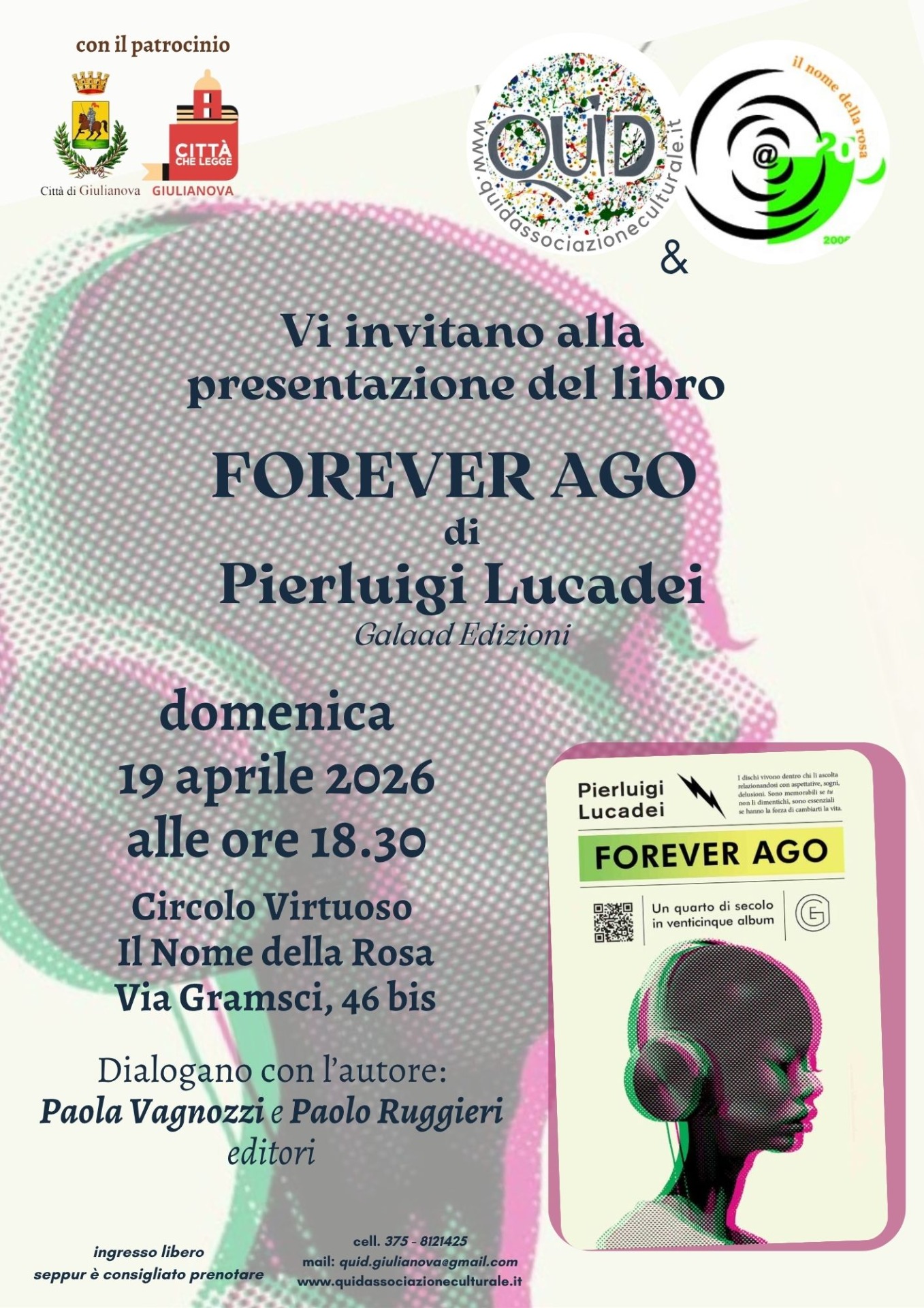 Domenica 19 aprile alle ore 18.30, Quid insieme al Circolo Virtuoso Il Nome della Rosa di Giulianova ospiteremo la presentazione del libro "Forever Ago. Un quarto di secolo in venticinque album" di Pierluigi Lucadei, pubblicato da Galaad Edizioni.