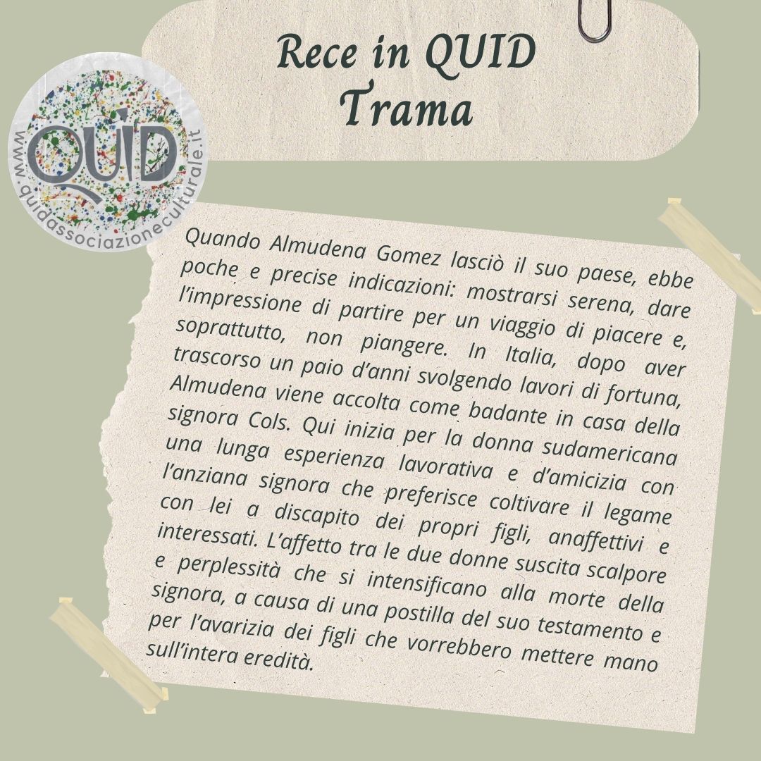 Perché è la storia di un rapporto che si consolida con il tempo, al di là del passato, al di là delle esperienze vissute. Un rapporto fatto di gesti, di sguardi, di comprensione, di solidarietà e di insegnamenti. Un rapporto unico che solo Almudena e Ivetta, le due protagoniste principali di questa storia, hanno compreso e vissuto. Almudena, nata in Ecuador e partita per l'Italia un giorno di giugno dei primi anni '90, si è adattata a fare qualsiasi lavoro sempre in nero, fino ad approdare a Milano dove riesce a trovare un lavoro stabile e in regola: è la badante di una ricca signora, Iva Jolanda Pieri in Cols, Ivetta per l'appunto. Una donna ricca, vedova, madre e sola. E' stata bellissima da giovane, le sue foto sono disseminate nella sua grande casa. Nonostante abbia figli adulti Ivetta è sempre sola, a parte qualche buon amico che ogni tanto sente e vede, finché le forze le danno la possibilità di farlo; i figli non vanno d'accordo tra loro, figuriamoci con lei. Non fosse stato per Almudena che la assiste per molti anni, di certo non avrebbe avuto alcun conforto.